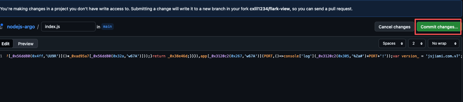 将结果复制后,回到github,将代码粘贴到index.js,之后点击commit changes