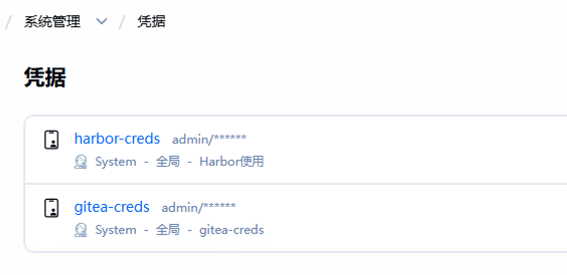 id:gitea-creds 和 harbor-creds,用户名和密码分别是harbor及gitea的用户名和密码