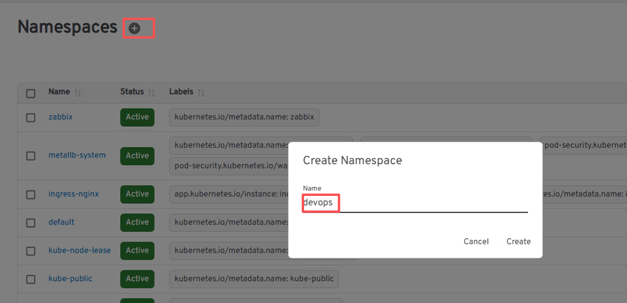 在headlamp的Namespaces界面点击+输入devops,再点击create