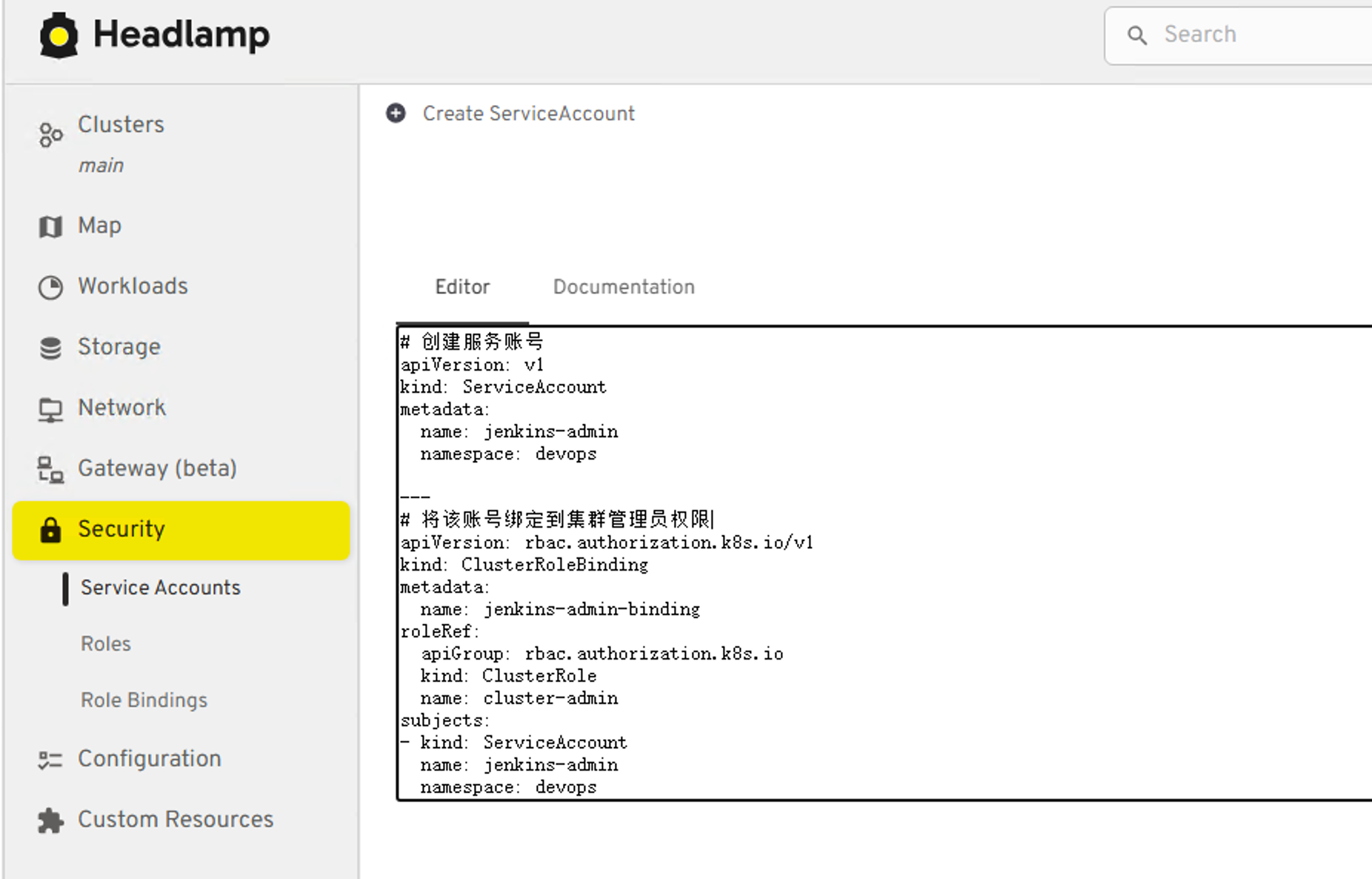 在headlamp的ServiceAccount输入如下YAML并创建